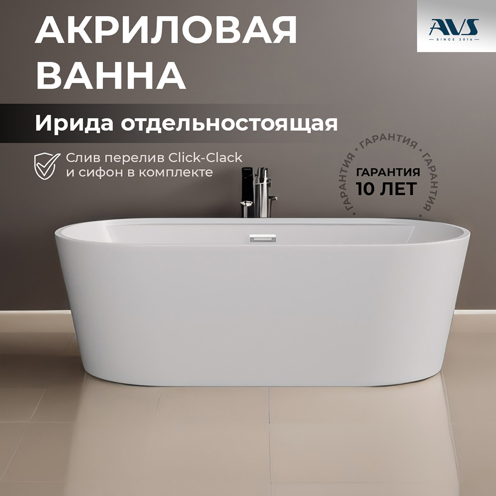 Акриловая ванна AVS Ирида 170х80 белая, с донным клапаном