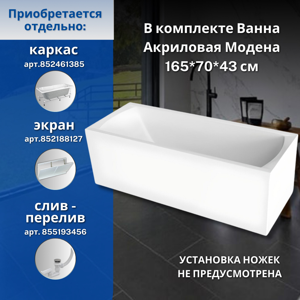 Акриловая ванна AVS Модена 165x70 белая, без каркаса